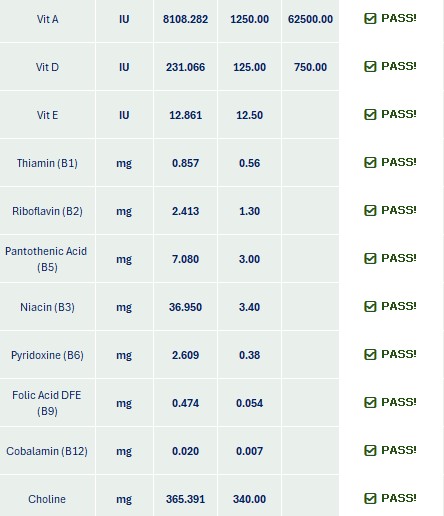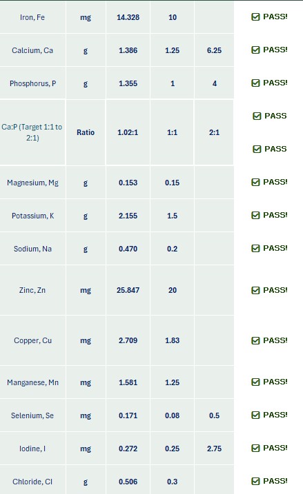 This is how a passing recipe looks in Molly's Magic Meal Maker. It lists all the nutrient markers, the recipe values for each, and how