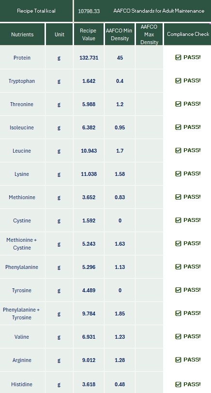 overall recipe aligns to the AAFCO guidelines on a per 1,000 Kcal basis.